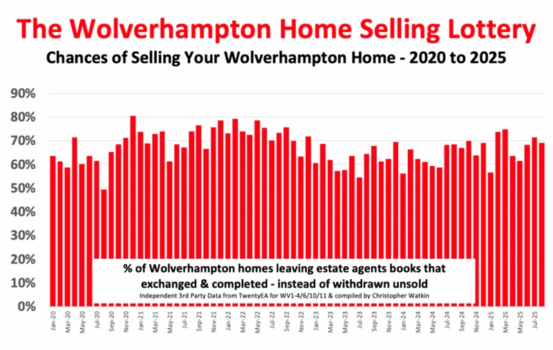 - Of the 2,417 Wolverhampton properties that left estate agents’ books in 2025 (so far), 9% exchanged and completed. The other 32.1% of homeowners, a total of 776 homes, withdrew from the market unsold.