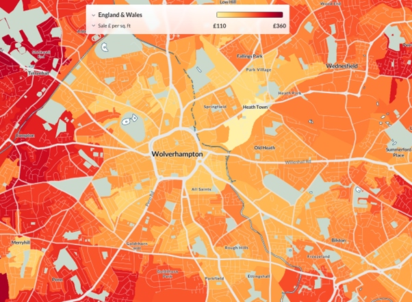 Wolverhampton is not one market. The old part, the interwar semis, new build estates, village edges, each has a different £ per sq. ft, so let’s look at this map …