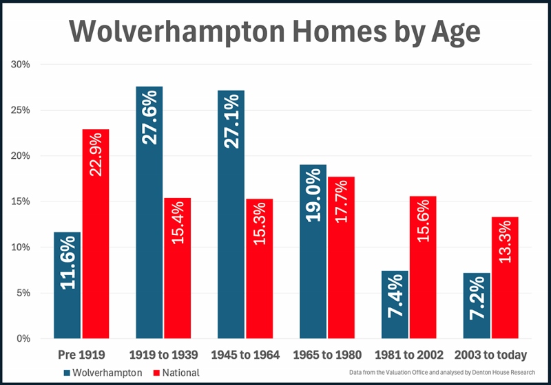 Wolverhampton is not defined by just one building era. It is defined by many. When you compare each age band with the national average, you see how unique the local housing really is.